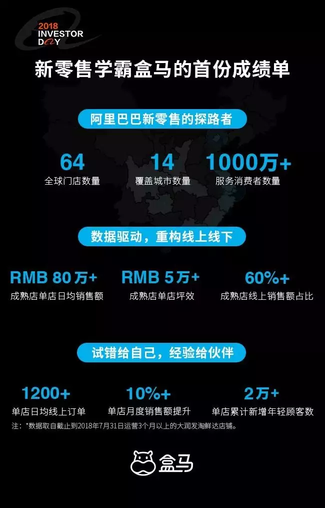盒馬的首份成績(jī)單顯示,截至2018年7月31日,盒馬已在全國(guó)擁有64家門(mén)店,分布在14個(gè)城市里,服務(wù)超過(guò)1000萬(wàn)消費(fèi)者。
