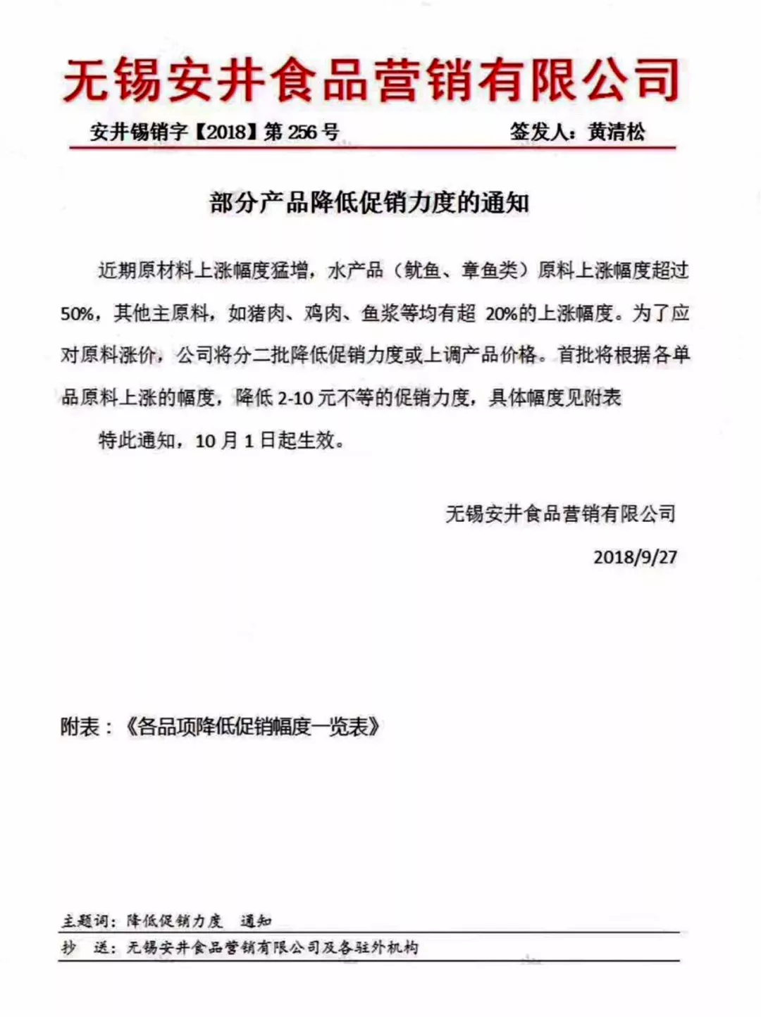 9月27日,無(wú)錫安井食品營(yíng)銷(xiāo)有限公司(簡(jiǎn)稱“安井食品”)發(fā)出的“部分產(chǎn)品降低促銷(xiāo)力度的通知”,在朋友圈廣為傳播。