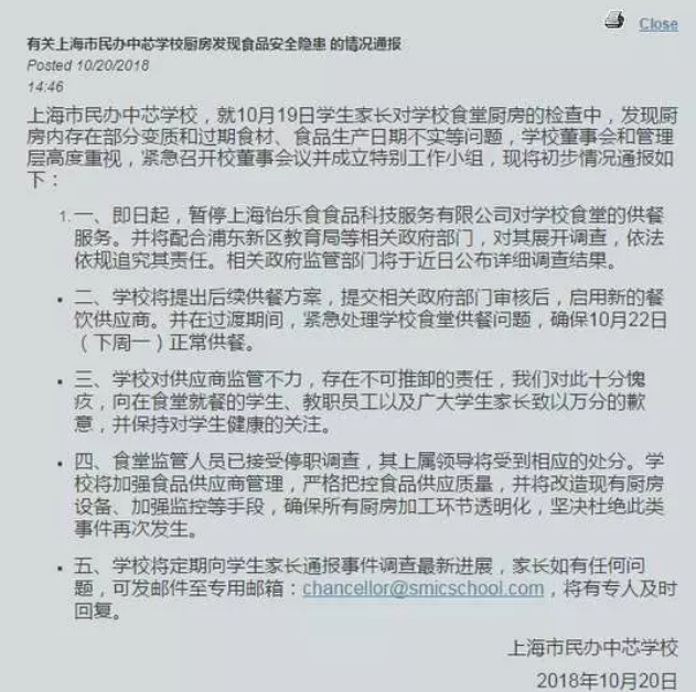 同時,并責令校方立即停止原承包商供餐,后續(xù)供餐方式由學校提出方案提交浦東市場監(jiān)管局和教育部門審核后再行供餐;要求中芯學校切實落實食品安全主體責任,進一步強化食品安全內(nèi)部管理。