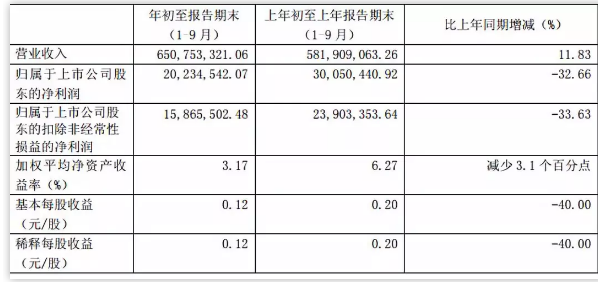 公告顯示,公司前三季度實(shí)現(xiàn)營(yíng)業(yè)收入 6.51億元,較上年度同期5.82億增長(zhǎng)11.83%;凈利潤(rùn)2,023萬(wàn)元,較上年度同期3,005萬(wàn)元下降32.66%。