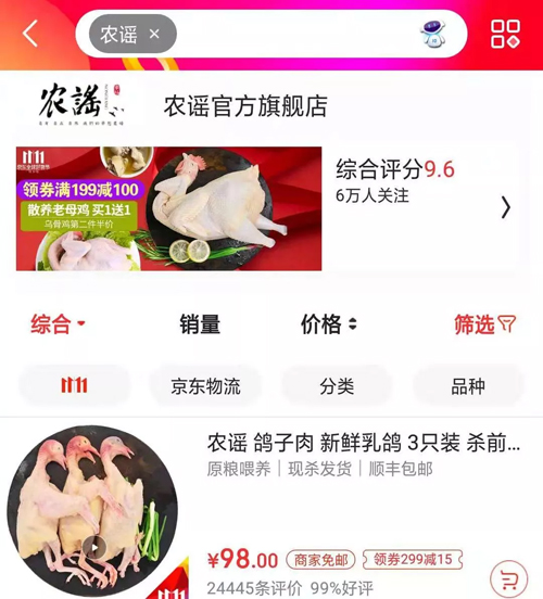 來(lái)源: 冷凍食品網(wǎng) 發(fā)布者:李雋從淘寶、天貓、1號(hào)店,再到京東生鮮,楊勇和他的“農(nóng)謠”新鮮乳鴿在每一個(gè)平臺(tái)上都名列前茅。
