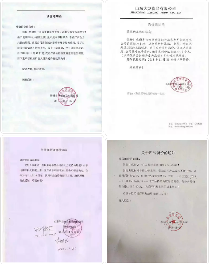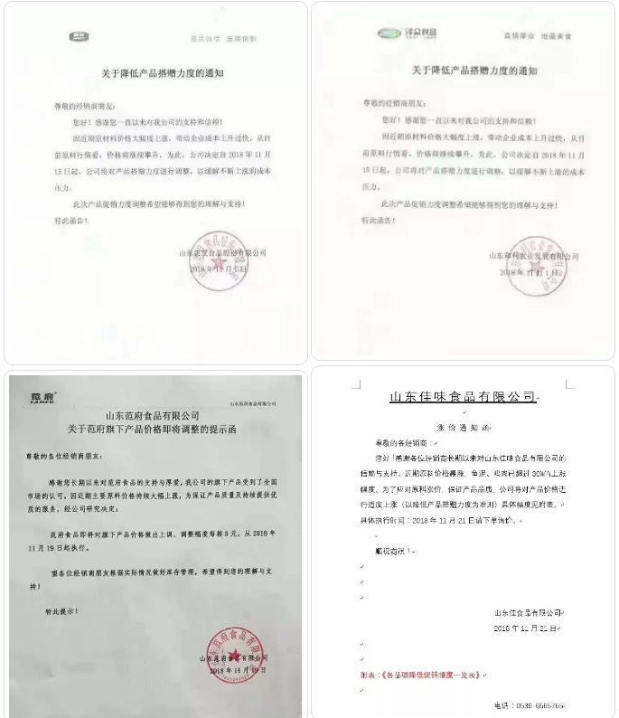 據(jù)小編的初步統(tǒng)計(jì),孚德食品公司、山東惠發(fā)食品股份有限公司、山東大龍食品有限公司、山東范府食品有限公司、華昌食品、濰坊禾眾食品有限公司等相繼推出調(diào)價(jià)通知函,具體內(nèi)容如下: