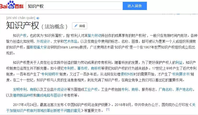 百度百科顯示,知識(shí)產(chǎn)權(quán),也稱其為“知識(shí)所屬權(quán)”,指“權(quán)利人對(duì)其智力勞動(dòng)所創(chuàng)作的成果享有的財(cái)產(chǎn)權(quán)利”,包括發(fā)明、外觀設(shè)計(jì)、文學(xué)和藝術(shù)作品,以及在商業(yè)中使用的標(biāo)志、名稱、圖像等,一般只在有限時(shí)間內(nèi)有效。