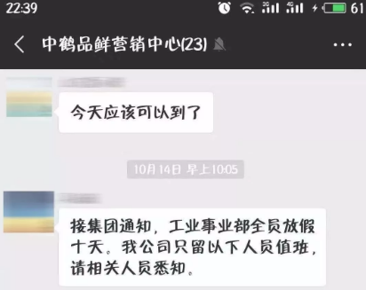 “9月底公司開會(huì)時(shí)通知10月份放假10天,到10月11日上班后,公司稱暫不上班繼續(xù)等通知;14日又接通知稱整個(gè)集團(tuán)放假10天,25日又讓繼續(xù)等通知。我們都是按公司通知放假的,但原品鮮公司人資部門負(fù)責(zé)人說(shuō)10月份沒(méi)去上班就沒(méi)有工資。”余某說(shuō)。