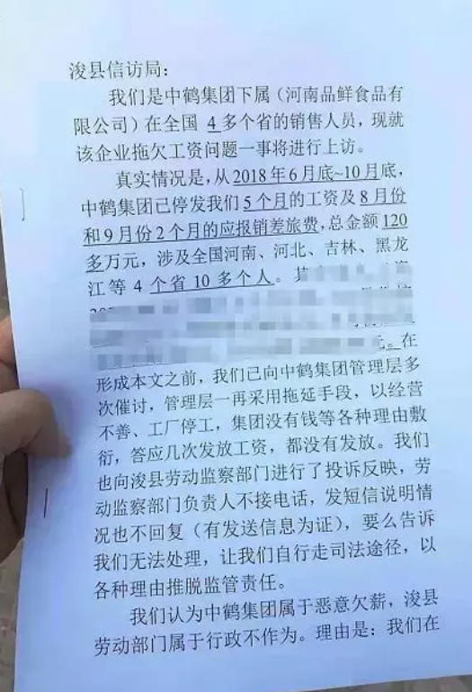 多位員工稱中鶴品鮮拖欠工資