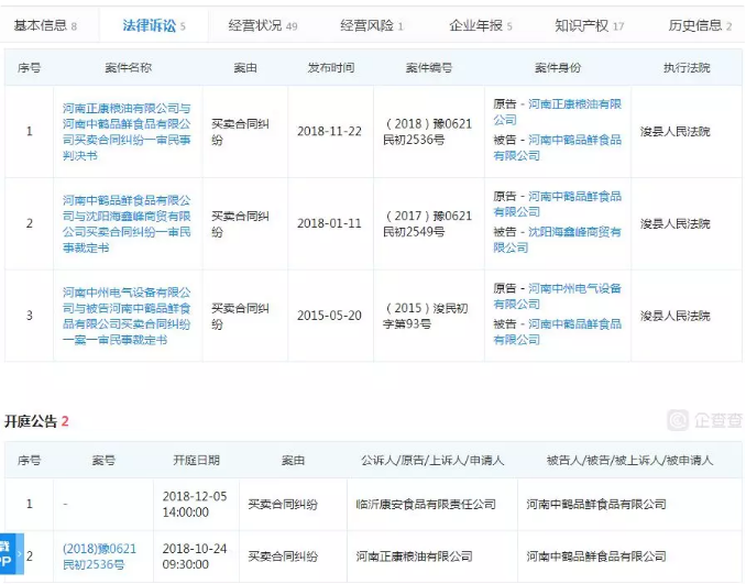 另一條原告臨沂康安食品有限責(zé)任公司與被告河南中鶴品鮮食品有限公司的買賣合同糾紛,該案件的開庭日期是12月5日14點(diǎn),截至記者發(fā)稿前,未在企查查上看到判決結(jié)果。