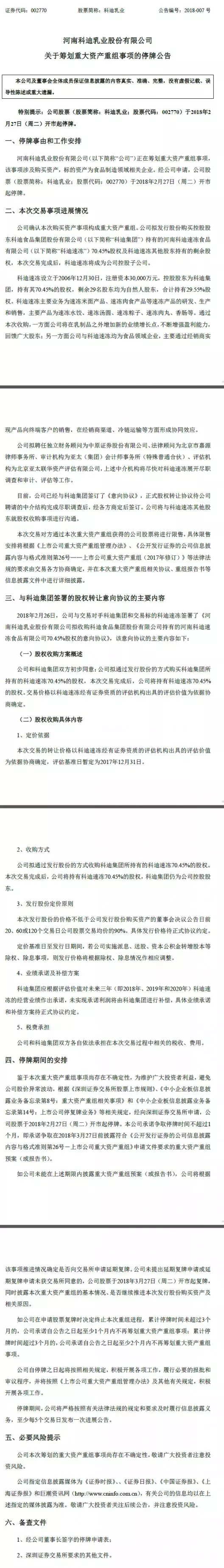 經(jīng)公司申請,公司股票(股票簡稱:科迪乳業(yè);股票代碼:002770)于2018年2月27日開市起停牌。