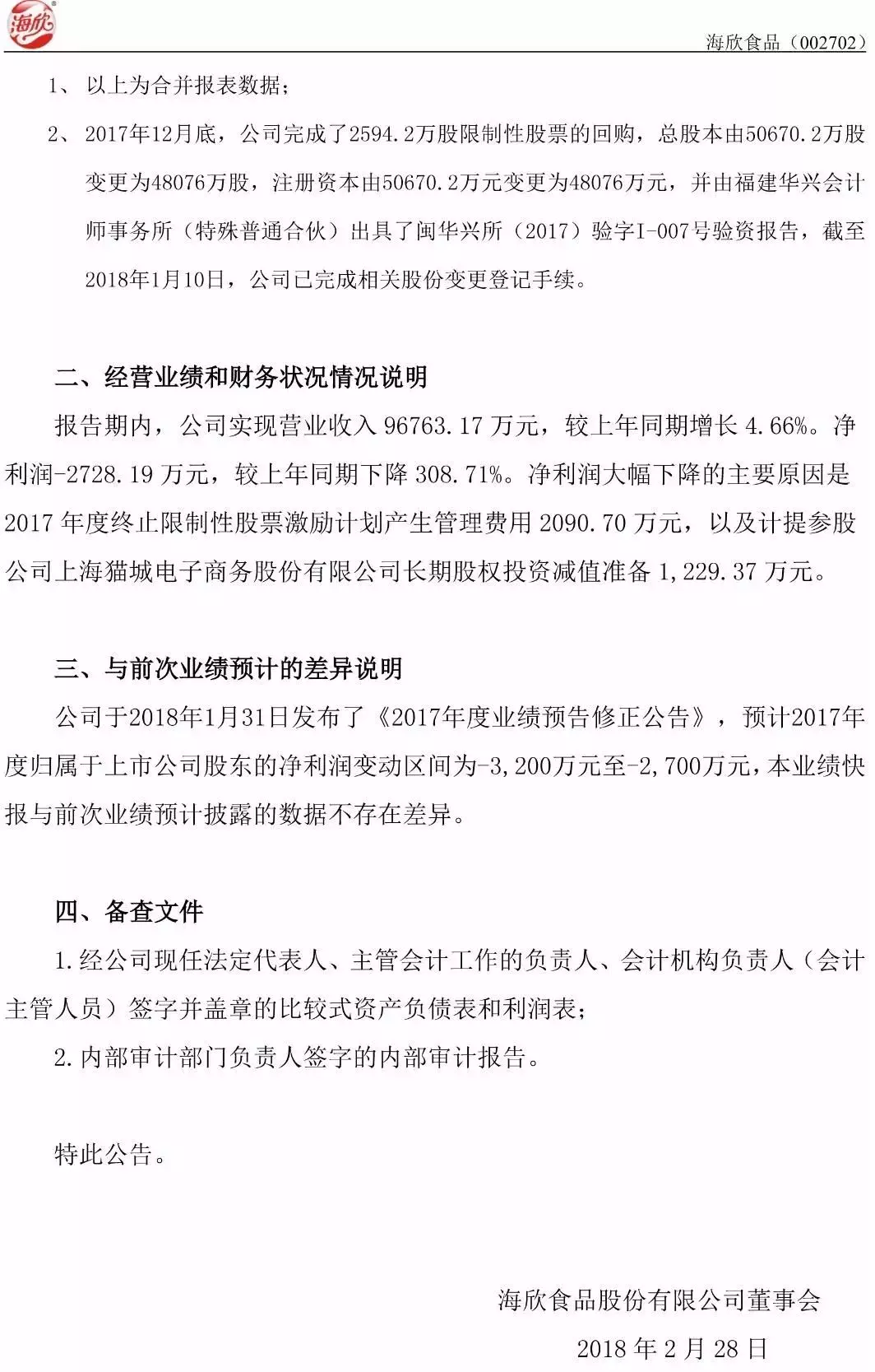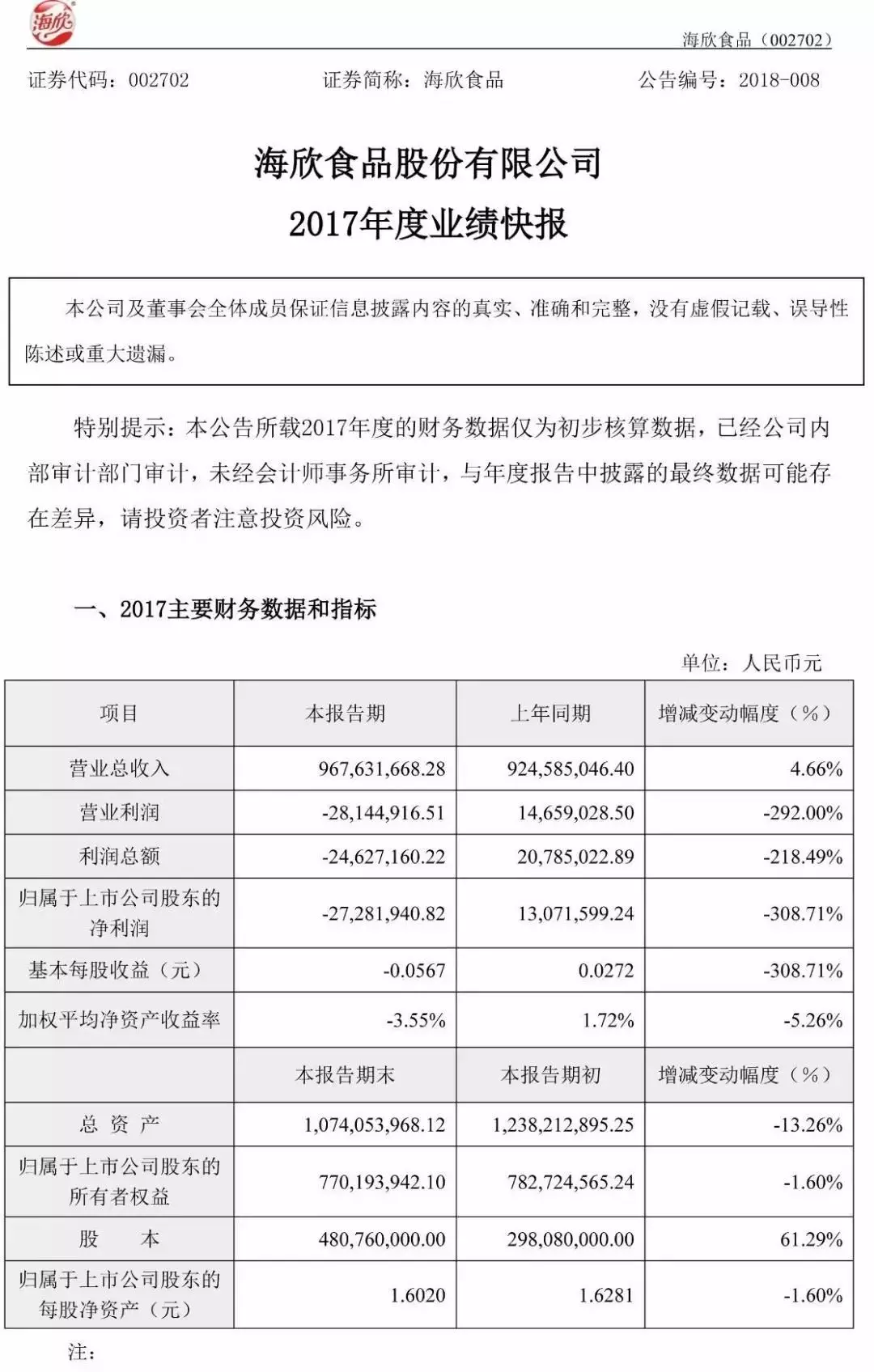 2月28日,海欣食品股份有限公司發(fā)布2017年度業(yè)績(jī)快報(bào),經(jīng)初步核算,報(bào)告期內(nèi),公司實(shí)現(xiàn)營(yíng)業(yè)收入96763.17萬(wàn)元,較上年同期增長(zhǎng)4.66%,營(yíng)業(yè)利潤(rùn)2814.49萬(wàn)元,較上年同期下降292%。歸屬上市公司股東的凈利潤(rùn)-2728.19萬(wàn)元,較上年同期下降308.71%。