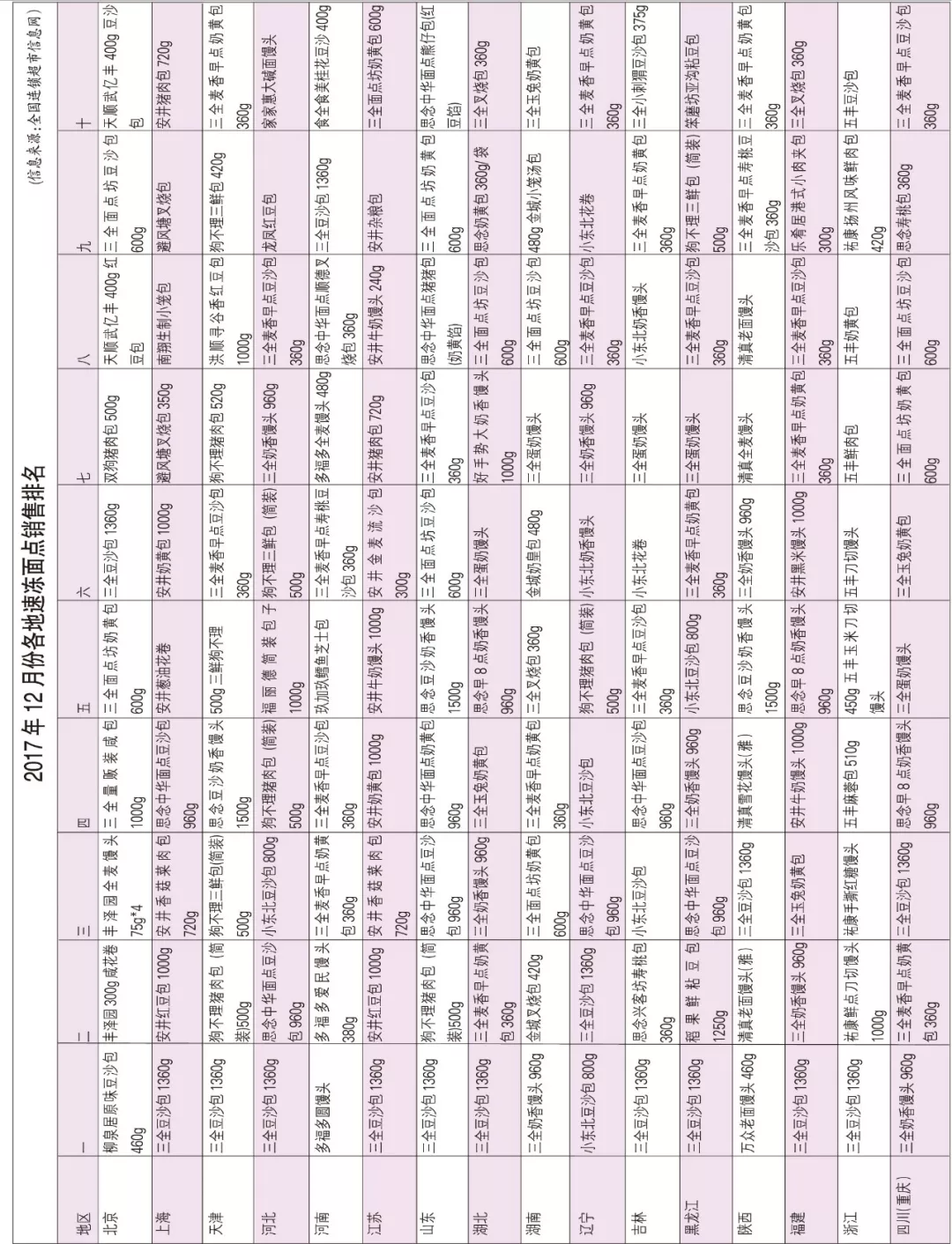 備注:該排名由全國連鎖超市信息網(wǎng)提供,數(shù)據(jù)來源于全國300多家大中小型超市系統(tǒng)的近2000家門店的冷凍食品銷量,不包含百貨商場及其他小店。各省份門店樣本數(shù)量不盡一致,排名情況,僅供參考。