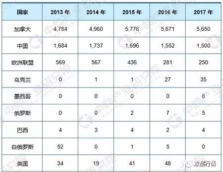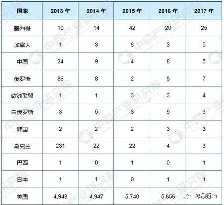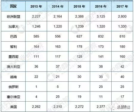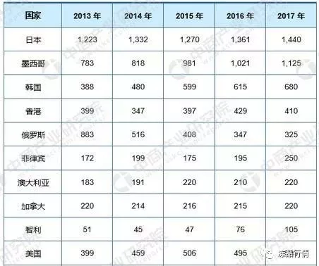 2013-2017年全球豬肉進(jìn)口量分國家統(tǒng)計(jì)表(千噸)