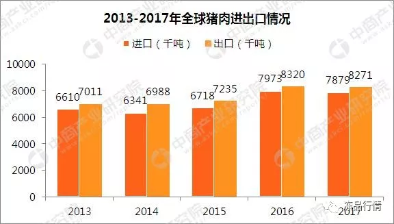 根據(jù)數(shù)據(jù)統(tǒng)計(jì),2017年全球豬肉進(jìn)口量為787.9萬噸,比2016年稍微下滑。出口量為827.1萬噸。