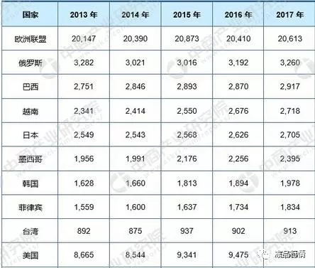 2013-2017年全球生豬存欄量分國家統(tǒng)計(jì)(千頭)