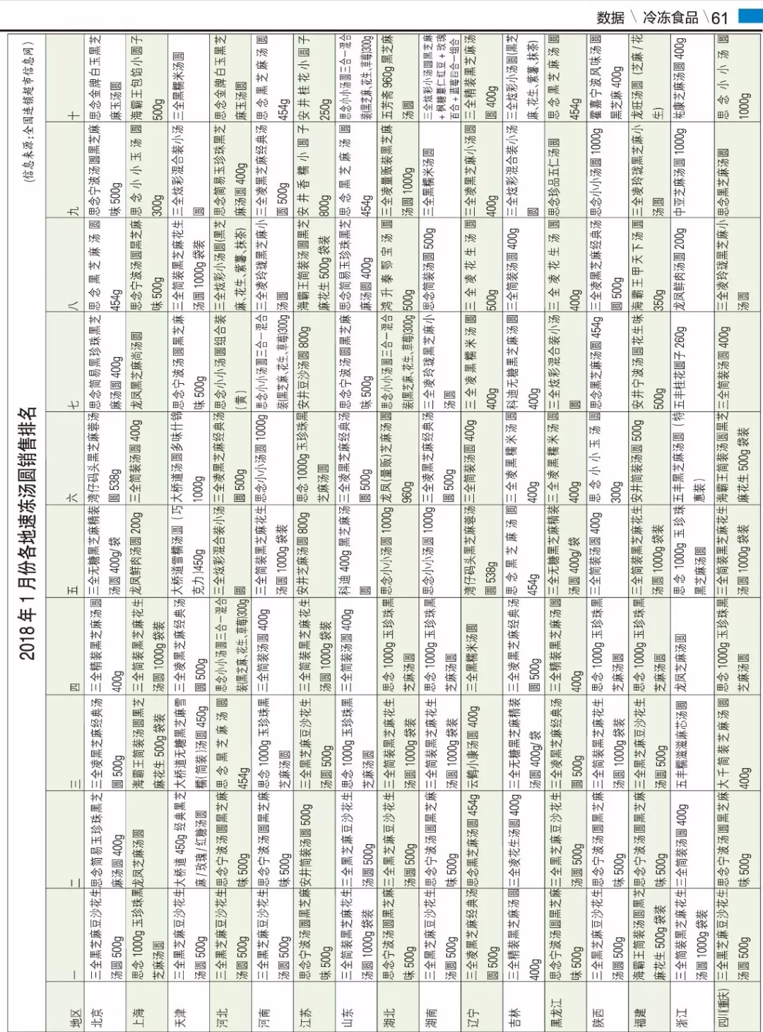 來源: 冷凍食品網(wǎng) 發(fā)布者:編輯▼2018年1月份各地速凍湯圓銷售排名、