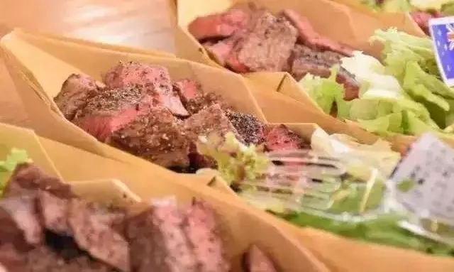 煎好的牛排分切后盛放在紙盒里,撒上海鹽和黑胡椒,并搭配一些蔬菜沙拉。整個(gè)過程只需三五分鐘。