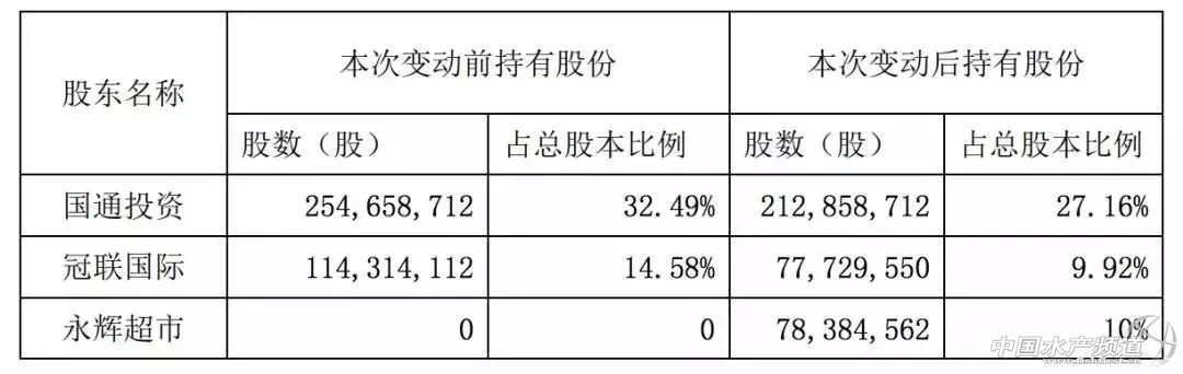 公告稱,國聯(lián)水產于 2018 年 3 月 23 日收到公司控制股東新余國通投資管理有限公司(以下簡稱“國 通投資”)、主要股東冠聯(lián)國際投資有限公司(以下簡稱“冠聯(lián)國際”)和永輝超市股份有限公司(以下簡稱“永輝超市”)簽署了《關于湛江國聯(lián)水產開發(fā)股 份有限公司之股份購買協(xié)議》的通知,國通投資和冠聯(lián)國際以協(xié)議轉讓的方式分別向永輝超市轉讓其持有的公司股份 41,800,000 股和 36,584,562 股,分別占公司股份總數的 5.33%和 4.67%,兩者合計轉讓公司股份 78,384,562 股,占公司股份總數的10%。