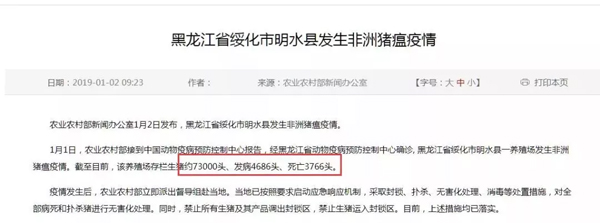 就在大家以為疫情趨緩之時(shí),元旦過后第一天,2019年1月2日上午9點(diǎn)半,農(nóng)業(yè)部發(fā)布了黑龍江省綏化市明水縣發(fā)生非洲豬瘟疫情,該養(yǎng)殖場(chǎng)存欄生豬約73000頭、發(fā)病4686頭、死亡3766頭。