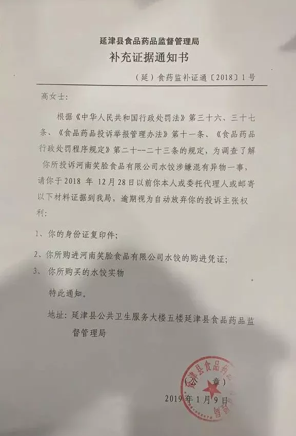 在這份《補(bǔ)充證據(jù)通知書》上,延津縣食藥監(jiān)局稱,為調(diào)查高女士所投訴的河南笑臉食品有限公司水餃涉嫌混有異物一事,高女士應(yīng)在2018年12月28日以前本人或委托代理人或郵寄材料證據(jù)到當(dāng)?shù)厥乘幈O(jiān)局,逾期視為自動放棄投訴主張權(quán)利。加蓋公章的文件落款時(shí)間為2019年1月9日。