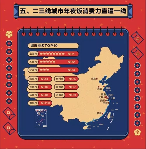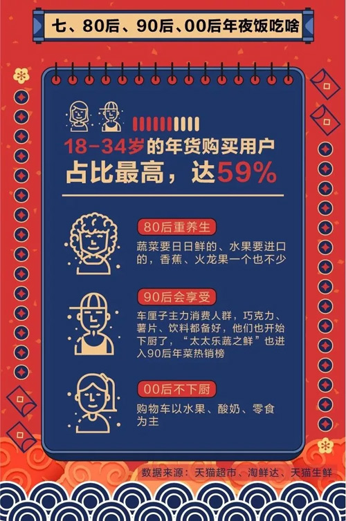 如今年夜飯下館子已經(jīng)不新鮮了,日前天貓發(fā)布的《中國人年夜飯消費報告》顯示,網(wǎng)購半成品年夜飯,已經(jīng)成為江浙滬包郵區(qū)80、90后年輕消費者的新選擇。