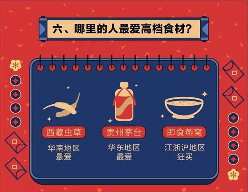 至于哪里的人最愛高檔年貨?天貓超市的數(shù)據(jù)還顯示,講究食療滋補的廣東人最愛西藏蟲草,而富庶的江浙滬用戶最愛貴州茅臺。