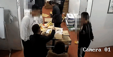 根據(jù)現(xiàn)場監(jiān)控畫面顯示,3月12日22時(shí)24分,圖像中央聚集了幾名家長,其中一位穿著黑色夾克的男子從地上撿起一袋姜黃粉( 一種調(diào)味料),撕開,灑向堆放在推車最上方的一箱冷凍雞腿上, 隨后摸出手機(jī)拍照。