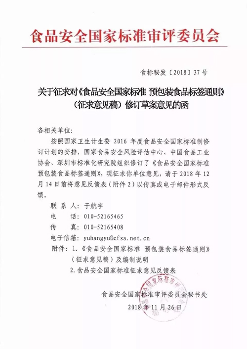 2018年底,食品安全國家標準審評委員會對外發(fā)布的關(guān)于征求對《食品安全國家標準 預(yù)包裝食品標簽通則》(征求意見稿)修訂草案意見的函。