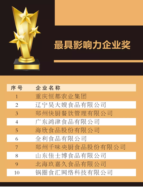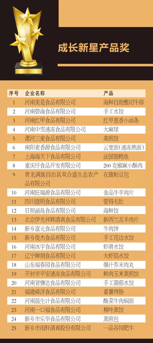 來源: 冷凍食品網(wǎng) 發(fā)布者:編輯8月18日上午,在2019中國(guó)冷凍食品產(chǎn)業(yè)大會(huì)優(yōu)秀展商頒獎(jiǎng)典禮上,最具影響力企業(yè)獎(jiǎng)、技術(shù)創(chuàng)新獎(jiǎng)、成長(zhǎng)新星產(chǎn)品獎(jiǎng)、杰出供應(yīng)商獎(jiǎng)4大獎(jiǎng)項(xiàng)名單滾燙出爐。