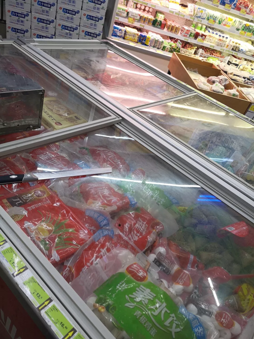 由于冷柜沒有顯示溫度,只能把手伸進去感知,結(jié)果是——稍感涼爽,凍感不強,但比菜店情況稍好。