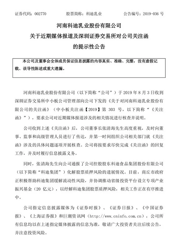 8月3日,在風(fēng)口浪尖上的科迪乳業(yè)收到深圳證券交易所中小板關(guān)注函,要求其就媒體報(bào)道的科迪乳業(yè)拖欠奶農(nóng)奶款、公司貨幣資金、合同糾紛等問(wèn)題進(jìn)行說(shuō)明,并要求2019年8月9日前回復(fù)。