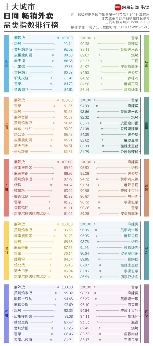 近日,網(wǎng)易數(shù)讀根據(jù)餓了么提供的數(shù)據(jù),統(tǒng)計(jì)了北京、上海、廣州、深圳、杭州、成都、重慶、西安、長沙、武漢10座城市的外賣排行榜,找到了稱霸中國外賣市場的那個(gè)它。