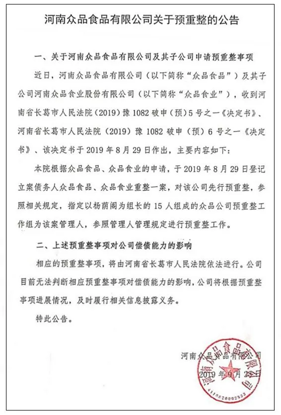 9月23日,眾品食品發(fā)布公告稱,近日,公司及其子公司眾品食業(yè)收到河南省長葛市人民法院下發(fā)的有關(guān)破產(chǎn)重整的決定書。上述法院根據(jù)眾品食品、眾品食業(yè)的申請,已于2019年8月29日登記立案債務(wù)人眾品食品、眾品食業(yè)重整一案,對該公司先行預(yù)重整。