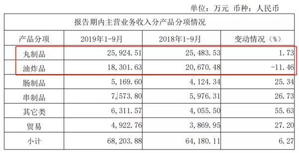丸制品和油炸品,一直是惠發(fā)食品最大的兩個產(chǎn)品品類,但前三季度,它們的增幅極低,分別為1.73%和-11.46%。油炸品還出現(xiàn)了負增長。