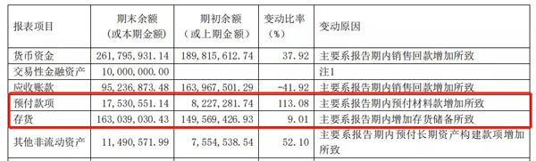 上圖為惠發(fā)食品公布的部分報表項目,從中可以看到,預付款項增幅較大,為113.08%?;莅l(fā)食品解釋,這是因為報告期內(nèi)預付材料款增加所致。