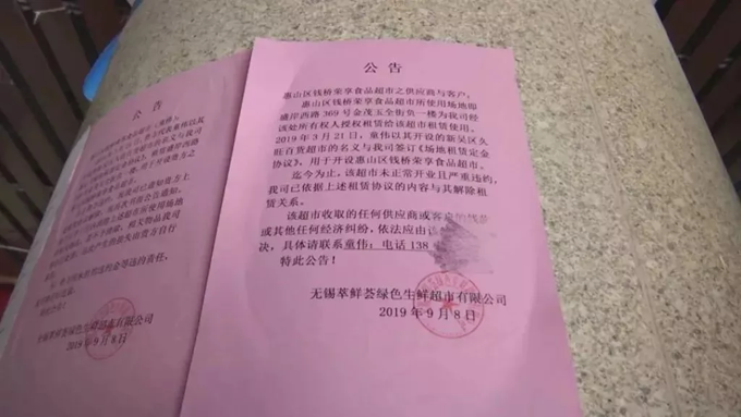 在超市外面的柱子上,貼了三張公告和一張溫馨提示, 租戶們講,他們事后了解到,租給他們攤位的實際上是二房東童先生,超市的租金、水電費等他也沒有跟大房東結(jié)清 。