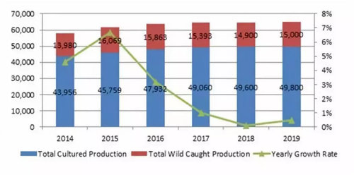 △2014-2019年中國(guó)海產(chǎn)產(chǎn)量及增長(zhǎng)率。數(shù)據(jù)來(lái)源:國(guó)家統(tǒng)計(jì)局
