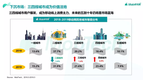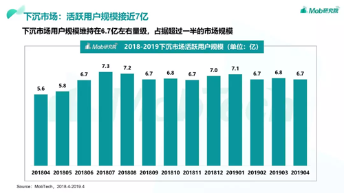 此外,Mob 研究院發(fā)布的《2019“下沉市場”圖鑒》顯示,下沉市場用戶規(guī)模 6.7億,占據(jù)一半以上的市場規(guī)模;下沉市場用戶日均使用時長為5小時,成為流量增長之源;下沉市場主流人群月收入低于 5000 元,但有房有車無貸款,講究性價比、生活幸福指數(shù)高。