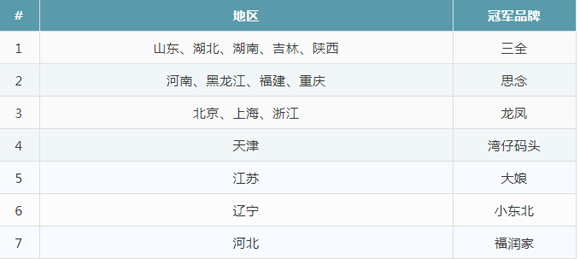 同之前獨(dú)攬8、9個(gè)第一相比,三全本月的業(yè)績略有下降,僅在5省獲得第一;思念食品緊隨其后,在4個(gè)省獲得第一,業(yè)績進(jìn)步明顯;龍鳳水餃后勢(shì)勁兒足,一舉拿下3省之冠;往月在北京、上海表現(xiàn)突出的灣仔碼頭,11月僅在天津一地奪冠;有趣的是,河北地區(qū)冒出個(gè)新冠軍——“福潤家順福東北風(fēng)味水餃”。