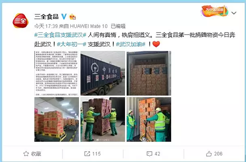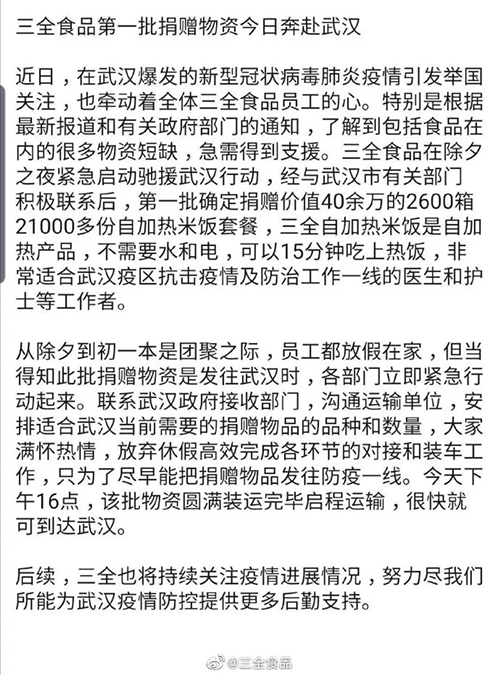 昨日,三全食品表示,該公司向武漢捐贈(zèng)的首批物資于當(dāng)日奔赴武漢。下午16點(diǎn),該批物資啟程運(yùn)輸,預(yù)計(jì)當(dāng)天晚上會(huì)抵達(dá)武漢。