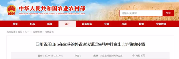 3月12日,農(nóng)業(yè)農(nóng)村部接到中國(guó)動(dòng)物疫病預(yù)防控制中心報(bào)告,經(jīng)四川省動(dòng)物疫病預(yù)防控制中心確診,在樂(lè)山市五通橋區(qū)冠英鎮(zhèn)查獲的一輛來(lái)自外省的生豬運(yùn)輸車(chē)中,排查出非洲豬瘟疫情。查獲時(shí),該車(chē)輛共載有生豬111頭,死亡7頭。