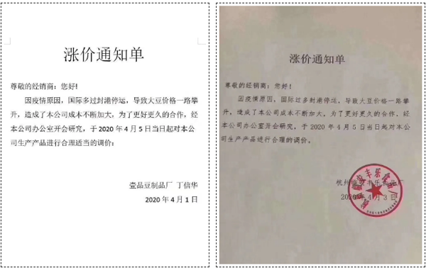 除了冷食企業(yè),近日,也有一大波專業(yè)豆制品加工企業(yè)下發(fā)漲價通知: