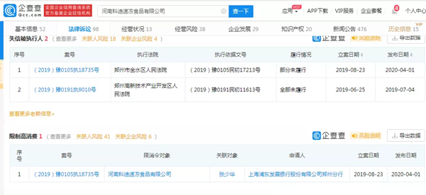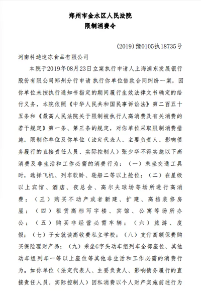 據(jù)企查查網(wǎng)站顯示,4月1日,科迪速凍被鄭州市金水區(qū)人民法院列為失信被執(zhí)行人,并對(duì)其發(fā)布了《限制高消費(fèi)》。不僅如此,2019年7月4日,科迪速凍還曾被鄭州新高技術(shù)產(chǎn)業(yè)開發(fā)區(qū)人民法院列為失信被執(zhí)行人。