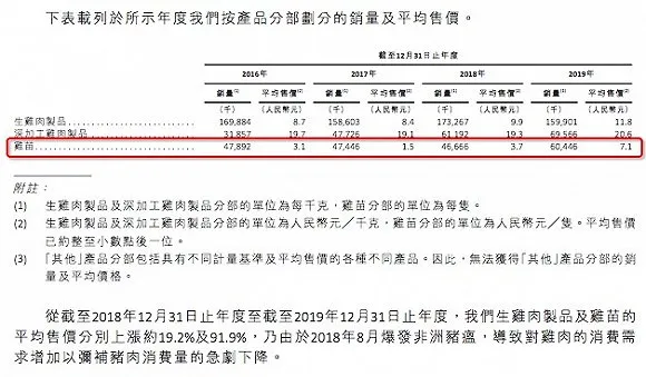 從鳳祥食品給出的主要三類產(chǎn)品價(jià)格趨勢看,每只雞苗的價(jià)格自2016年至2019年分別為3.1元、1.5元、3.7元、7.1元 ,雞苗價(jià)格在2019年翻了一番。
