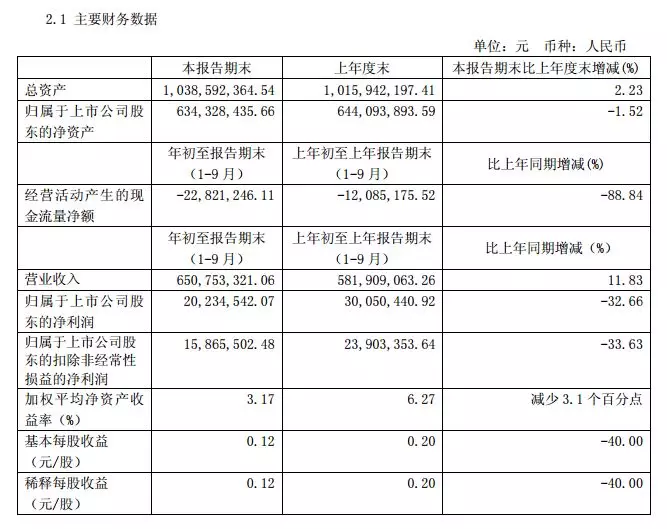 公告顯示,公司前三季度實(shí)現(xiàn)營業(yè)收入 6.51億元,較上年度同期5.82億增長11.83%;實(shí)現(xiàn)凈利潤2,023萬元,較上年度同期3,005萬元下降 32.66%。